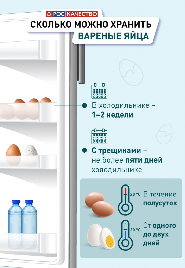 В холодильнике варёные яйца могут хранится 1–2 недели. Однако, если на них появились трещины, то срок их годности в таком случае сокращается до пяти дней. При хранении в помещении с температурой воздуха ниже +20-ти градусов яйца продержатся до двух дней, а если выше — их рекомендуют съесть за половину суток.