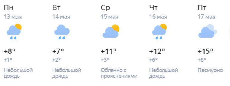 В пятницу воздух прогреется до +10 градусов, однако настроение подпортят небольшие дожди, которые продлятся весь день. Ветер юго-западного направления будет несильным — до 5 м/с. В субботу и воскресенье погода изменится не сильно: 11 мая пройдёт небольшой дождь, а на следующий день будет облачно с прояснениями. Температура воздуха днём достигнет лишь +8 градусов.