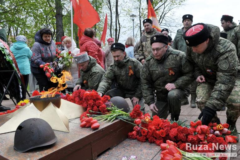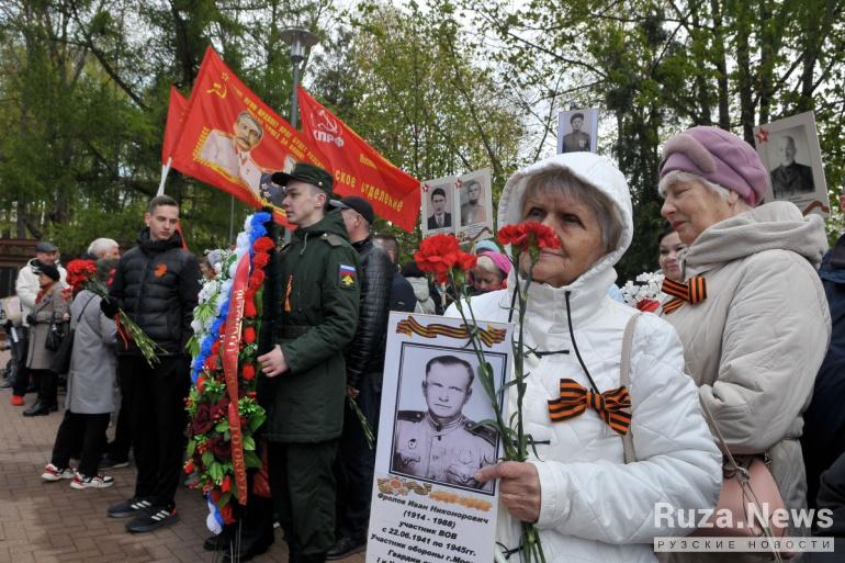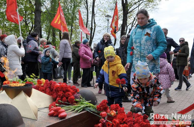 Здесь собралось большое количество жителей, чтобы почтить память героев Великой Отечественной войны