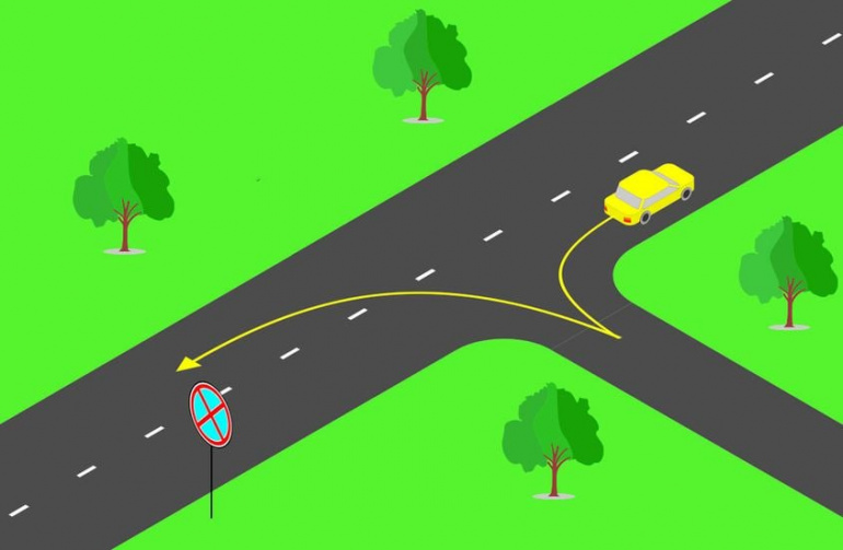 Рассмотрим задачу: разворот на дороге с использованием заднего хода в зоне действия знака «Остановка запрещена». Здесь речь не о перекрёстке, выезде из двора.