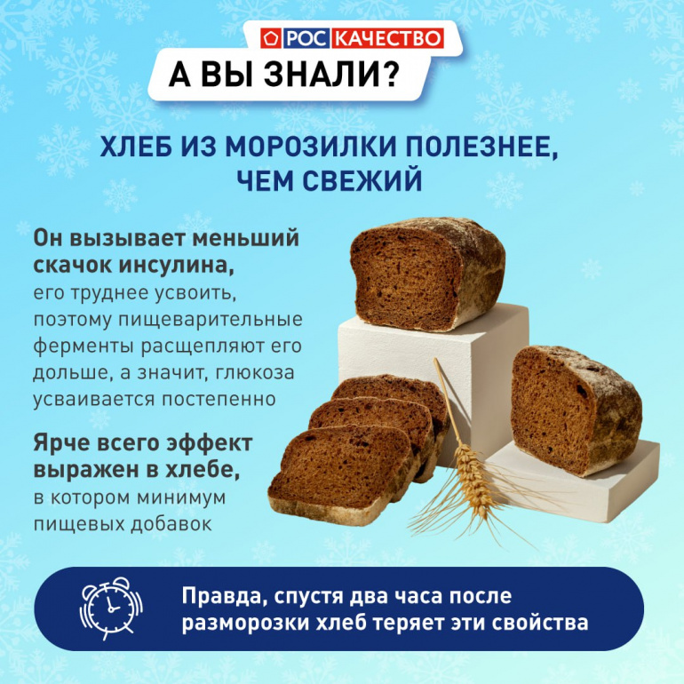 — В морозилке крахмал сжимается сильнее, чем в холодильнике, поэтому замороженный хлеб полезнее, — пояснили партнёру нашего издания, сайту Pchela.news, специалисты Роскачества. — Правда, спустя два часа после разморозки продукт теряет эти свойства.