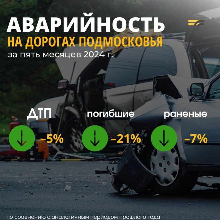 В Минтрансе Подмосковья уточнили, что за пять месяцев текущего года на дорогах региона зафиксировали 1256 аварий с погибшими и ранеными. Это на 5% меньше, чем за аналогичный период прошлого года.