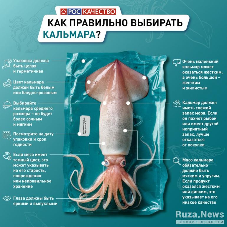 При выборе кальмара нужно обращать внимание на его упаковку, цвет, размер, глаза и запах. Подробнее смотрите в инфографике.