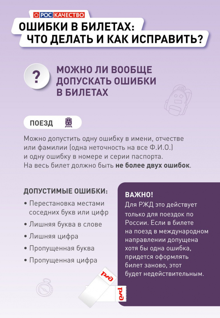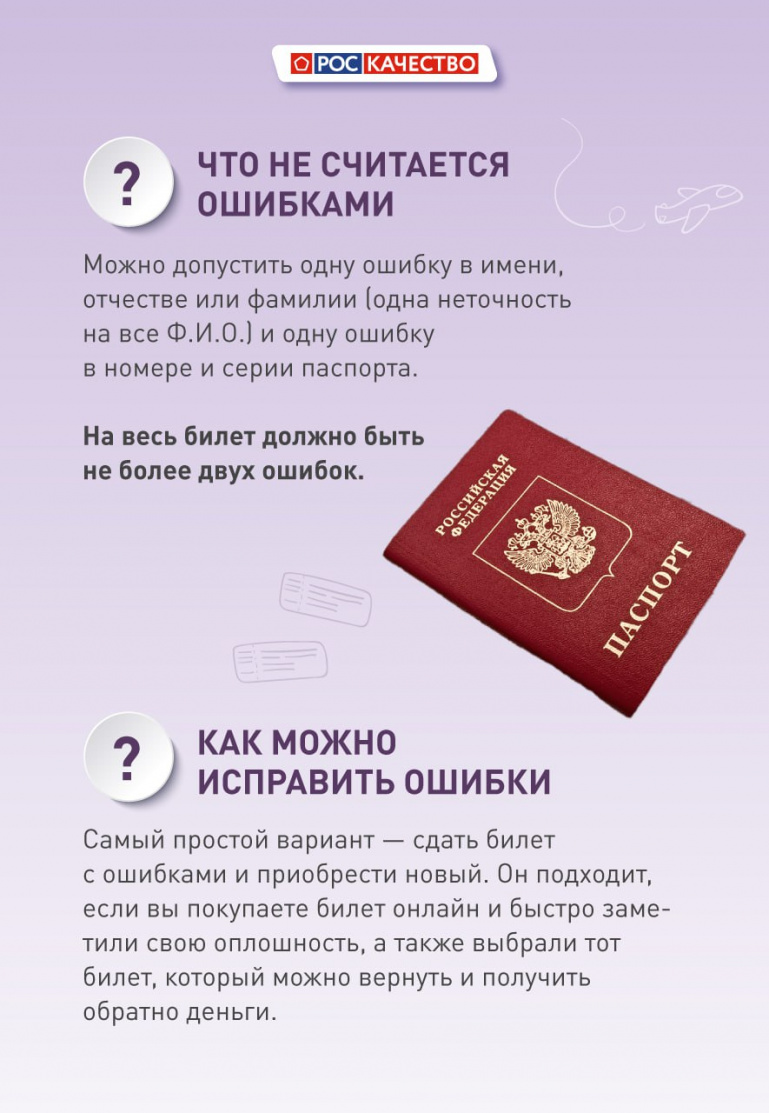 Можно допустить одну ошибку в имени, отчестве или фамилии, а также ещё одну в номере и серии паспорта. На весь документ должно быть не более двух неточностей. Однако эти правила касаются лишь путешествий на поездах по России.