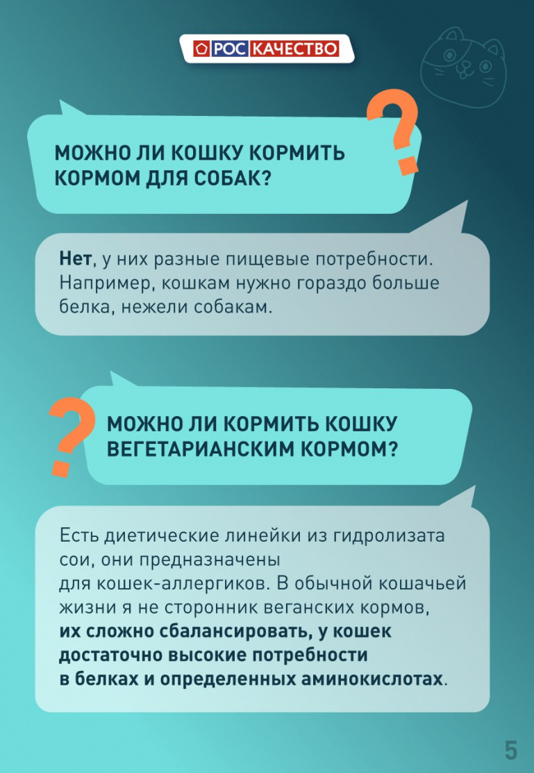 Кормить кошек собачьим кормом нельзя, ведь у них разные пищевые потребности. Кроме того, не стоит давать питомцу вегетарианский корм, если ему не прописана такая диета.