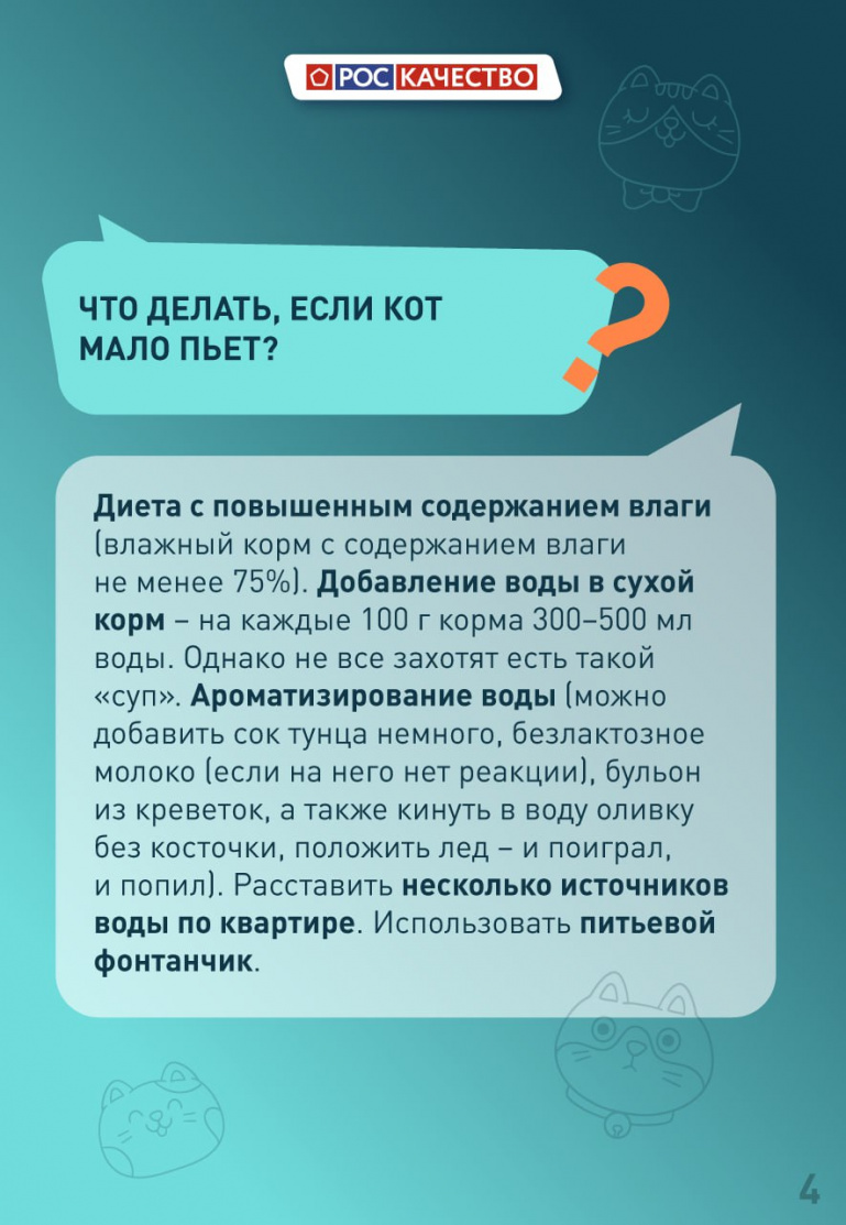 Если кот мало пьёт, то можно давать ему корм с содержанием влаги не менее 75%, добавлять в пищу ароматизированную воду (бульоны, сок тунца), использовать питьевой фонтанчик и расставить по квартире несколько источников воды.