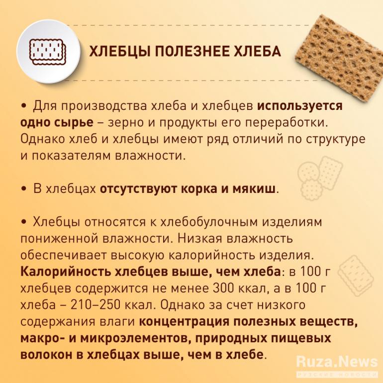 Первое их отличие — хлебцы за счёт более низкой влажности калорийнее, чем хлеб. По этой же причине в них выше концентрация полезных веществ и клетчатки.