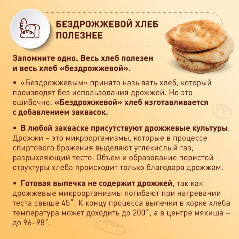 В действительности, называть хлеб бездрожжевым некорректно. При том, что в любой закваске присутствуют дрожжевые культуры, в готовой выпечке их нет, так как микроорганизмы погибают при температуре выше 45 градусов.