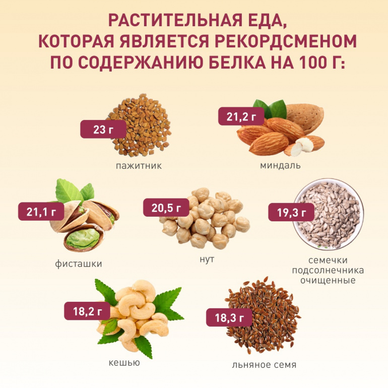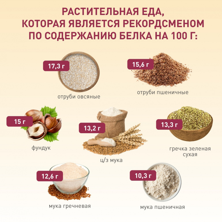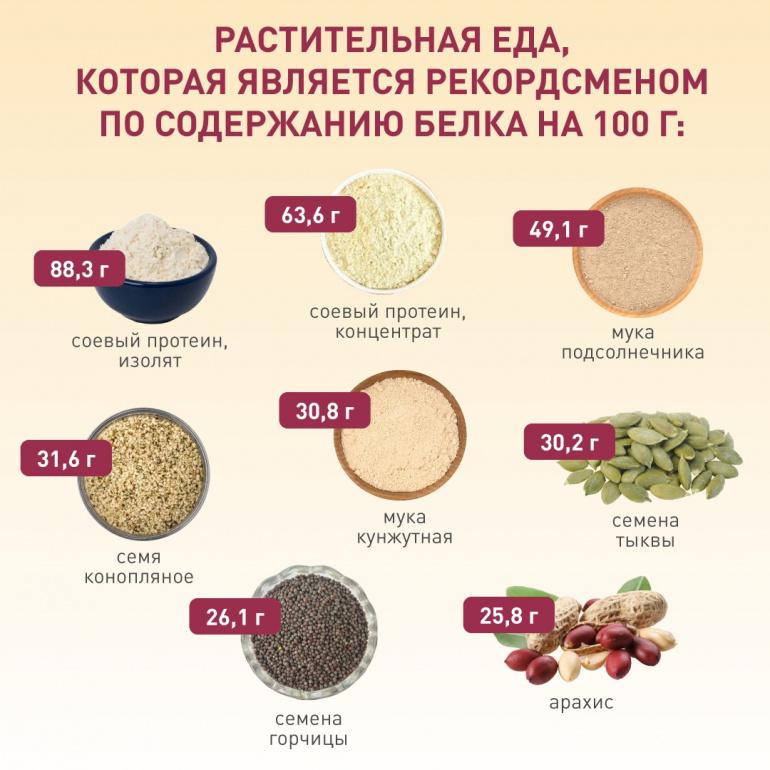 Из растительных продуктов наибольшее содержание белка — у соевого изолята и соевого концентрата, а также муки подсолнечника.