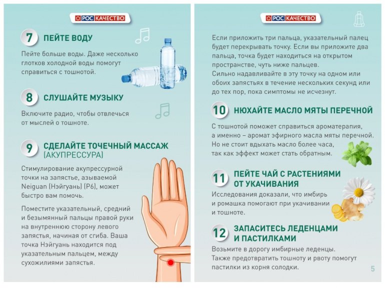 Первым делом специалисты рекомендуют поменять положение тела, это может отвлечь от мыслей о тошноте или вовсе нивелировать симптомы. Можно смотреть на горизонт, сидя на передних рядах автобуса или катера. Также важно сидеть по направлению движения.