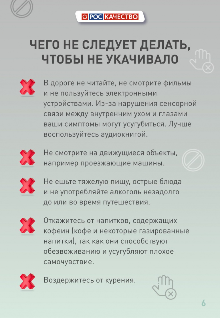 Есть также ряд антирекомендаций. Не стоит смотреть фильмы или читать с гаджетов, смотреть на проезжающие машины, есть перед поездкой или в дороге тяжёлую, жирную или кислую пищу, пить кофе или газировки с кофеином, употреблять алкоголь и курить.