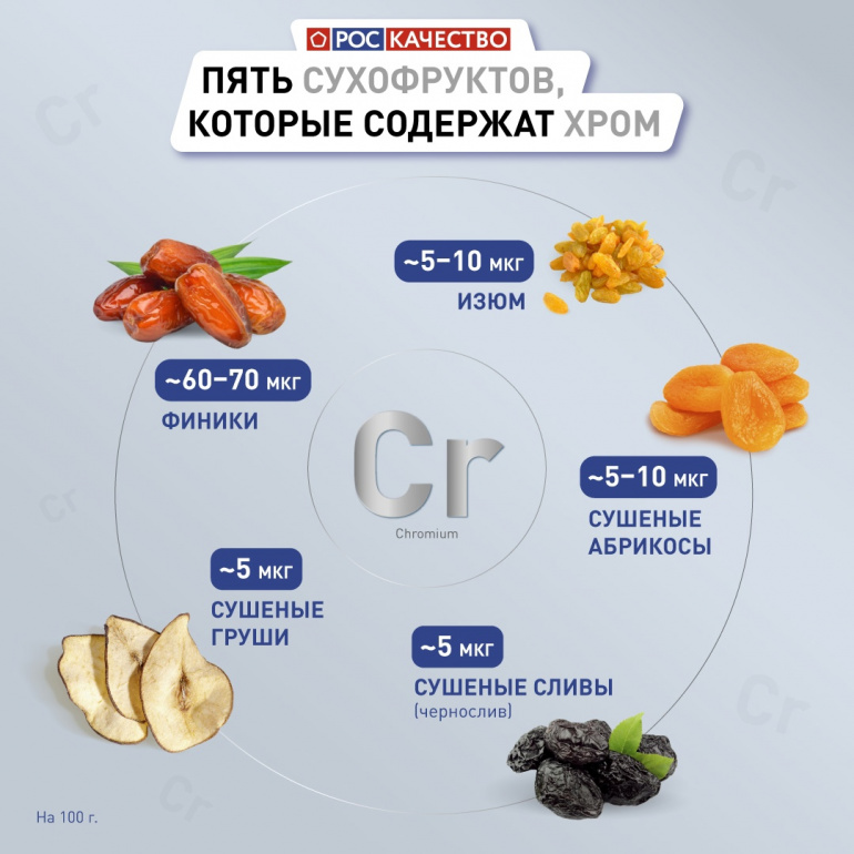 Также богаты хромом сухофрукты, такие как чернослив, финики, изюм, сушёные груши и абрикосы.