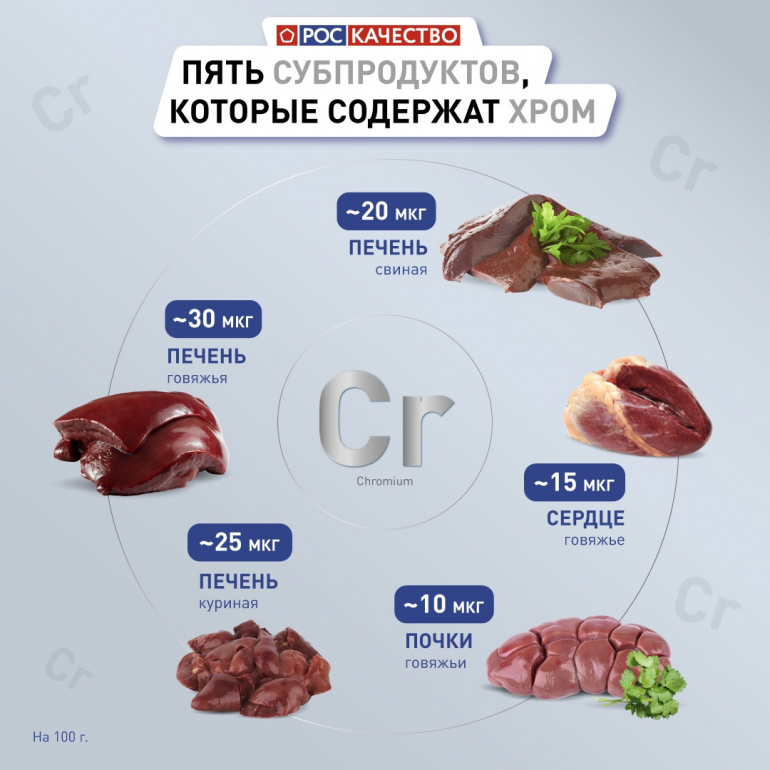 В субпродуктах, включая говяжью, куриную и свиную печень, почки и сердце, также содержится значительное количество хрома.