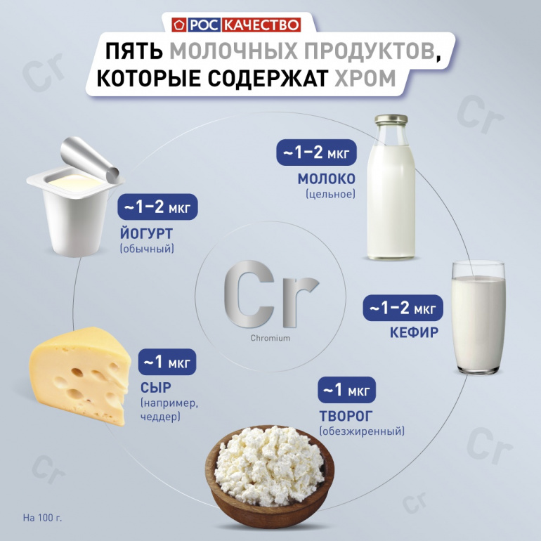 Среди молочных продуктов хром содержится в молоке, сыре (особенно твёрдых сортов), кефире, твороге и йогурте.
