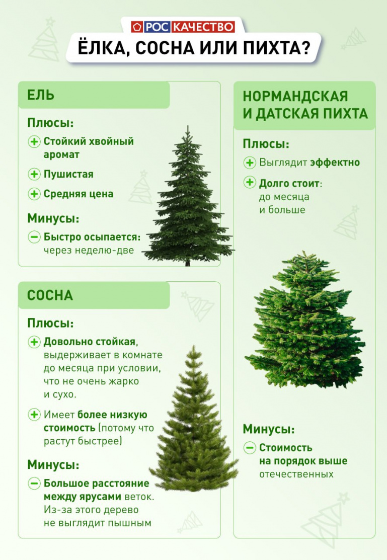Ёлки имеют красивую форму и приятный аромат, но быстро осыпаются. Сосна более стойкая и стоит дешевле. Если хочется, чтобы дерево радовало дольше, то обратите внимание на нормандскую и датскую пихты.