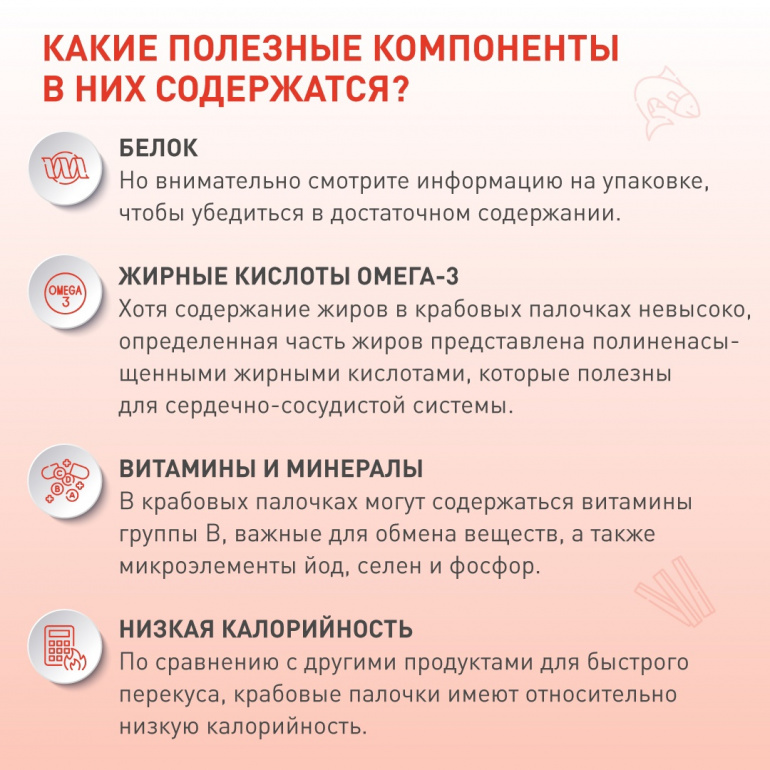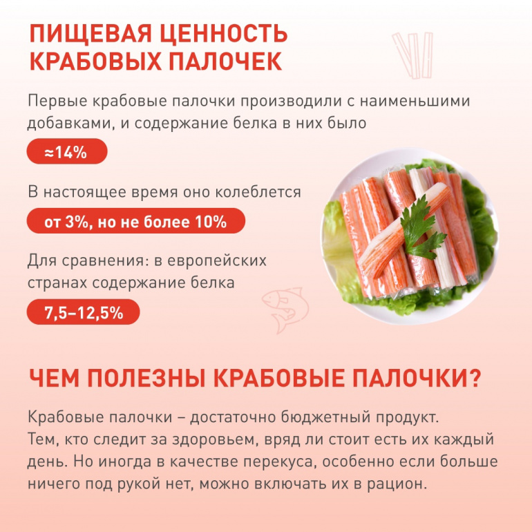 Крабовые палочки можно назвать неплохим перекусом, хотя их не стоит употреблять ежедневно. На упаковке стоит обращать внимание на содержание белка: обычно его уровень составляет от 3 до 10 процентов, и чем выше этот показатель, тем полезнее продукт для организма.