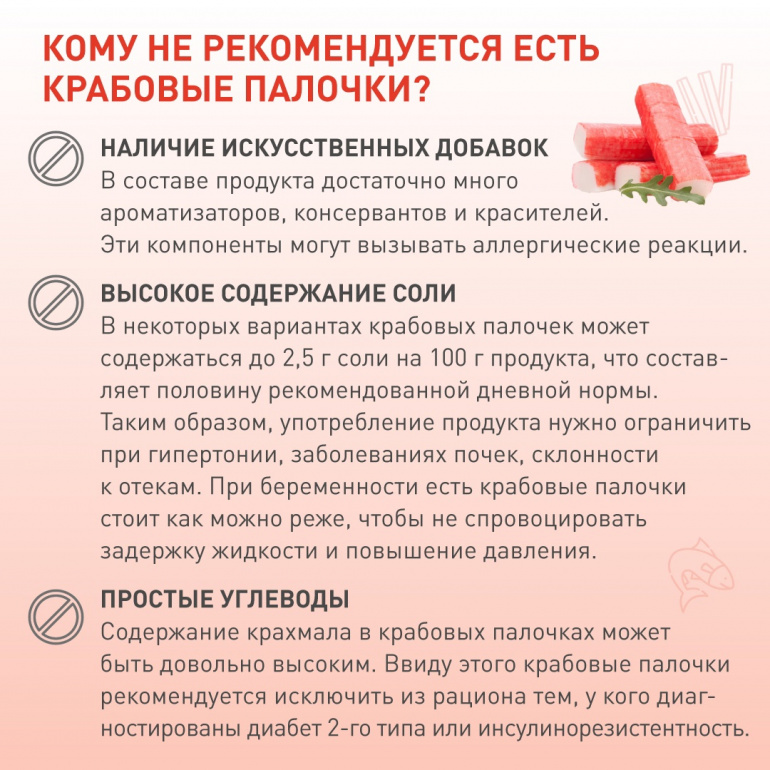 Тем не менее, крабовые палочки нельзя назвать идеальным перекусом. В них много соли, ароматизаторов, красителей, консервантов и простых углеводов. Поэтому употребление этого продукта стоит ограничить при гипертонии, инсулинорезистентности, диабете второго типа, склонности к отёкам, заболеваниях почек, а также во время беременности.