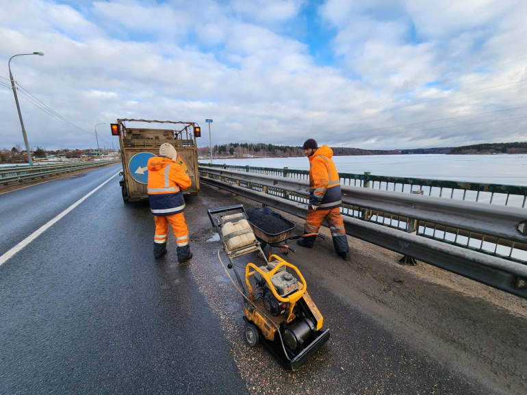 Тёплая погода позволила рабочим приступить к ямочному ремонту региональной трассы А-108 под Рузой. Они уже обновили дорожное покрытие на мосту над Озернинским водохранилищем.