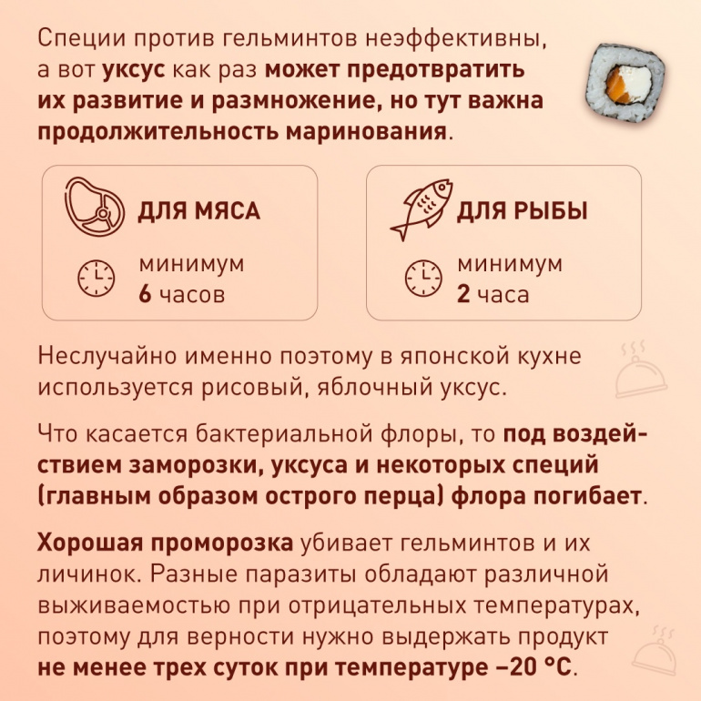 Некоторые способы обработки, такие как заморозка или использование специй, способны частично снизить риски, но не могут гарантировать полную безопасность продукта. Глубокая заморозка эффективна в борьбе с паразитами, однако не уничтожает все бактерии и вирусы, в том числе норовирус. Добавление специй, уксуса, лимонного сока или соли может замедлить рост микроорганизмов, но не обеспечивает их полное уничтожение.