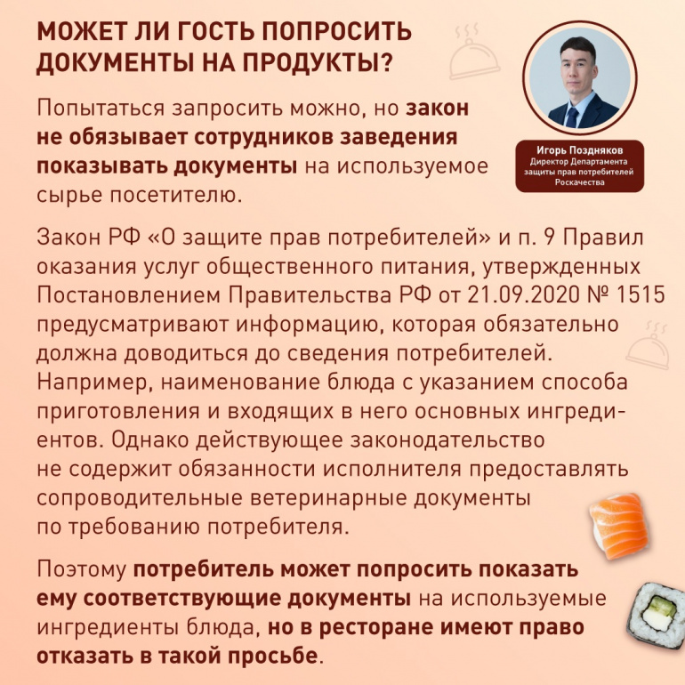 Если у гостя ресторана возникают сомнения в качестве продуктов, он вправе запросить документы, подтверждающие их безопасность. Заведения, следящие за своей репутацией, как правило, не отказывают в предоставлении сертификатов и ветеринарных справок. Однако если персонал уклоняется от ответа или отказывается демонстрировать документы, это повод усомниться в качестве используемых ингредиентов.