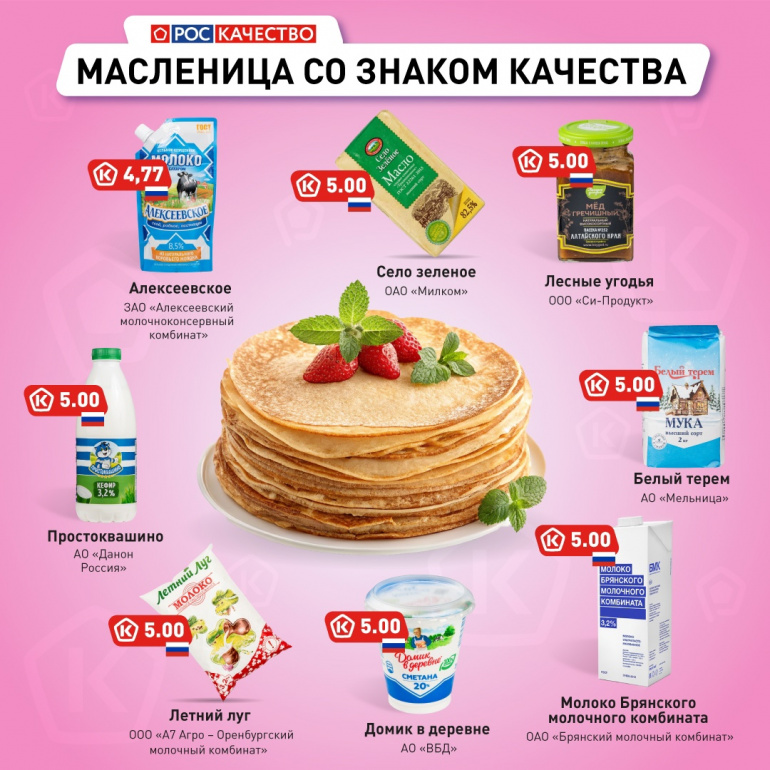 В список рекомендованных продуктов вошли сгущённое молоко «Алексеевское», масло «Село Зеленое», мёд «Лесные угодья», кефир «Простоквашино», мука «Белый терем», молоко Брянского молочного комбината и «Белый луг», а также сметана «Домик в деревне».