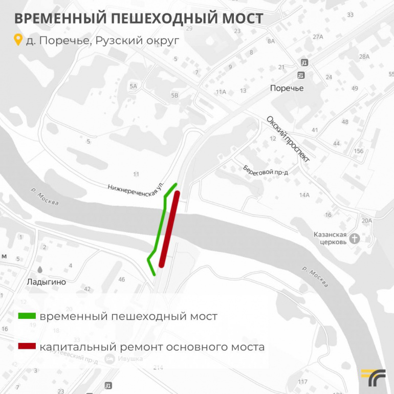 В деревне Поречье заканчивают строительство временного моста для пешеходов через реку Москва. Все работы завершат до 20 марта, а уже с 1 апреля на время ремонта там полностью закроют основной мост. В связи с этим изменятся схемы движения на двух автобусных маршрутах.