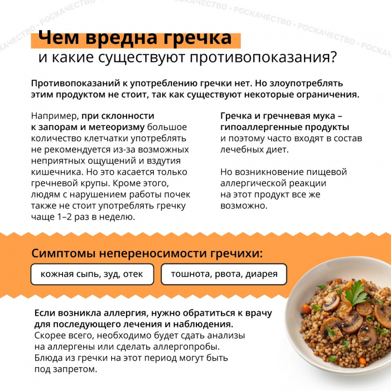 Несмотря на всю свою пользу, гречка имеет и некоторые противопоказания. В редких случаях она может вызывать индивидуальную непереносимость. При обострении гастрита или язвы желудка её употребление может привести к раздражению слизистой оболочки. Кроме того, чрезмерное употребление гречки может вызвать дискомфорт в кишечнике, вздутие и метеоризм. Диеты, основанные исключительно на гречке, могут привести к дефициту других важных для организма питательных веществ, поэтому важно включать её в рацион в сочетании с другими продуктами.