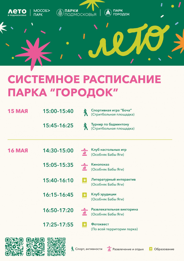В четверг гостей и жителей округа приглашают повеселиться, поучаствовав в спортивной игре «Боча» и турнире по бадминтону. А в пятницу можно будет поиграть в настолки с Бабой Ягой, посмотреть фильмы, найти ответы на сложные загадки и развлечься на фотоквесте.