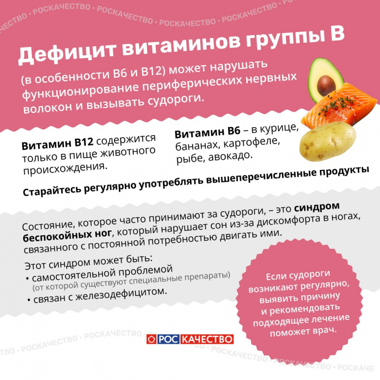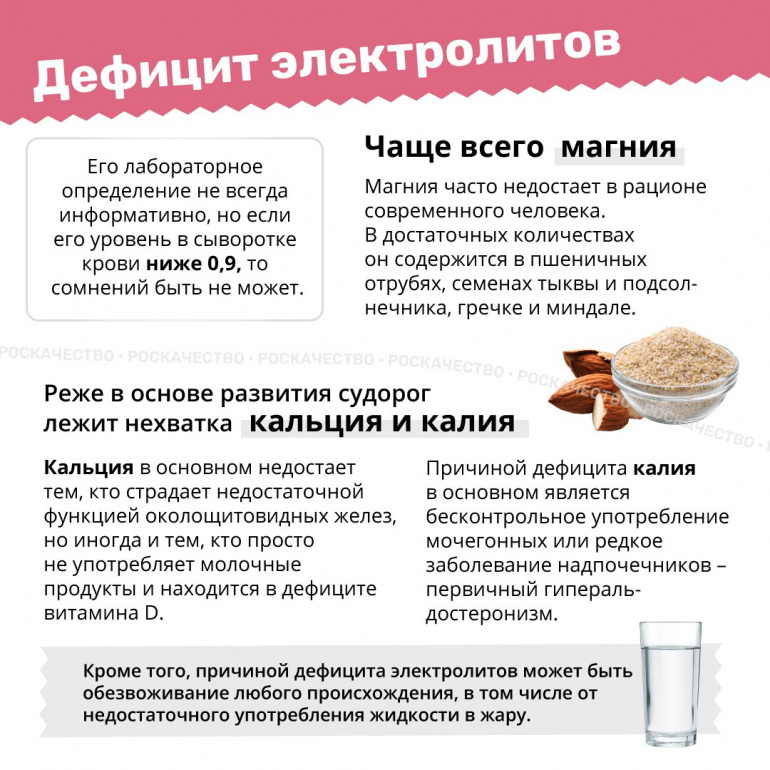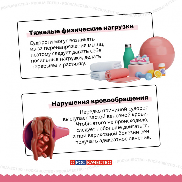 Также судороги могут возникать при нехватке важных минералов — магния, кальция и калия. Такое часто случается в жару, при активном потоотделении или из-за приёма мочегонных. Поэтому важно пить достаточно воды и следить за сбалансированным питанием.