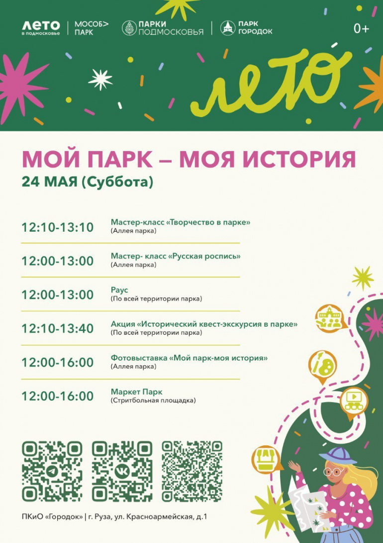 В предстоящую субботу, 24 мая, в парк «Городок» города Руза приглашают на общеобластное мероприятие «Мой парк — моя история». Организаторы обещают мастер-классы, маркет, выставки и концерт.