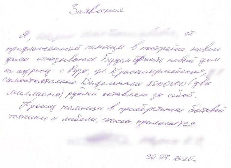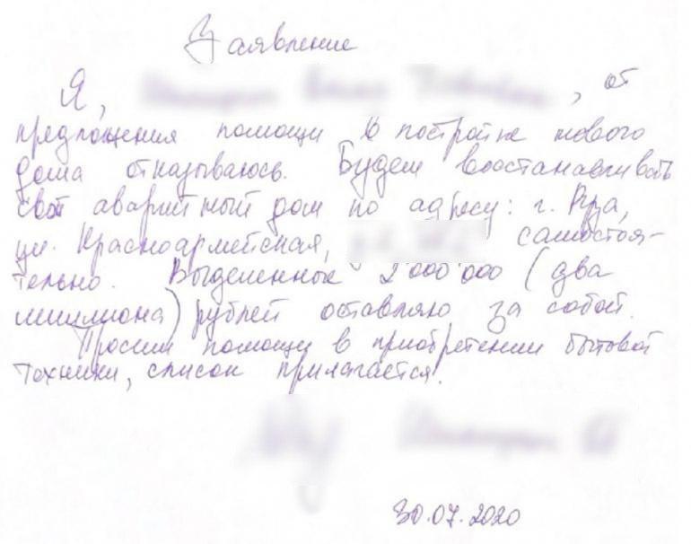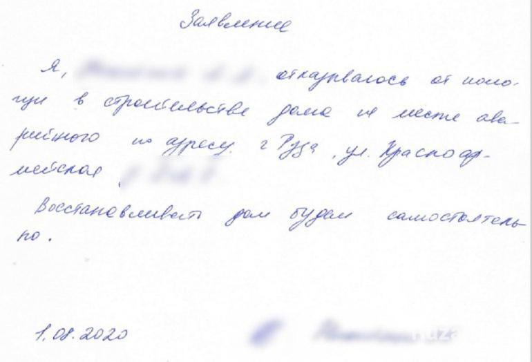 В распоряжении сайта Ruza.News оказались копии заявлений от жителей на получение финансовой помощи. В каждом из них пострадавшие от потопа отказались от предложенной помощи в постройке дома.