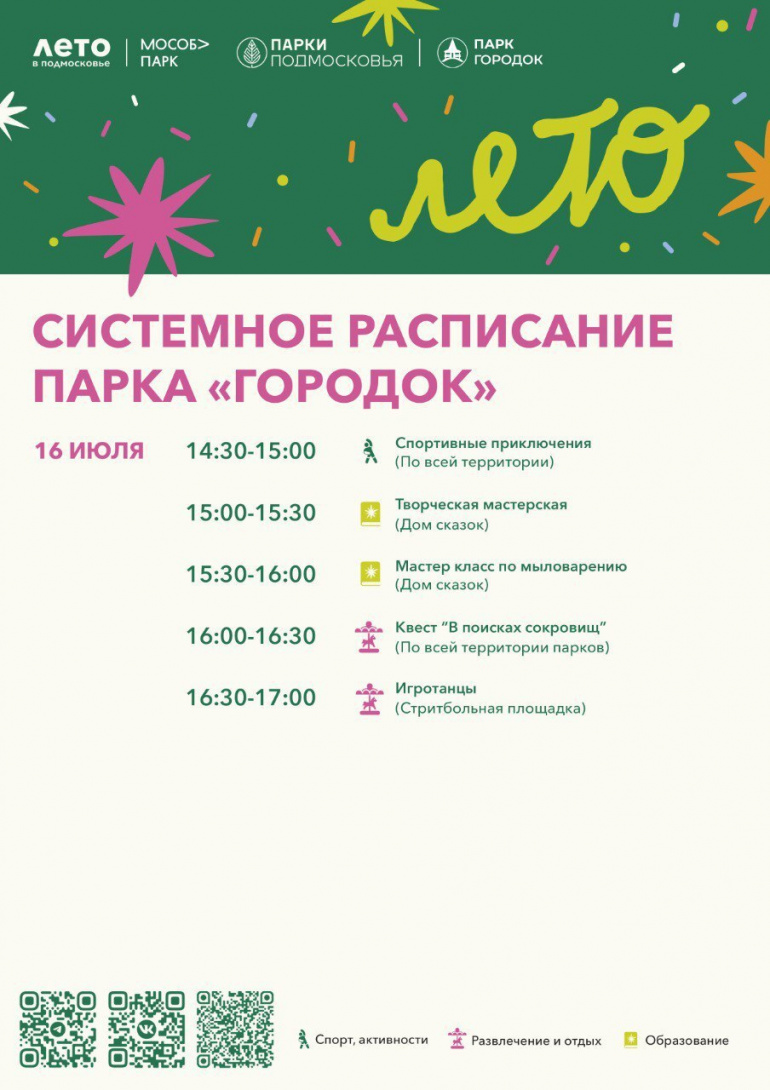Среда, 16 июля, начнётся со спортивных приключений, а затем посетителей парка приглашают в творческую мастерскую. С 15:30 до 16:00 будет проходить мастер-класс по мыловарению, а затем стартует квест «В поисках сокровищ». День завершится игровыми танцами на стритбольной площадке.
