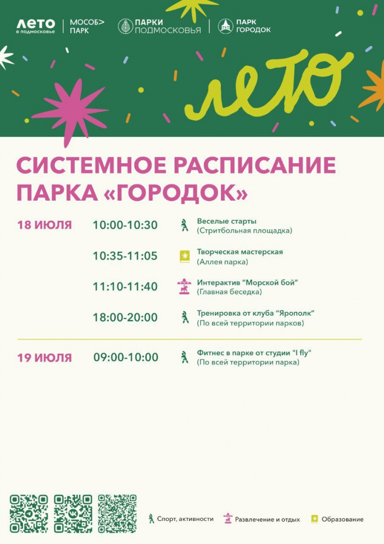 В пятницу, 18 июля, для посетителей организуют весёлые старты, творческую мастерскую и тренировку от клуба «Ярополк». А в субботу утром можно будет позаниматься фитнесом.