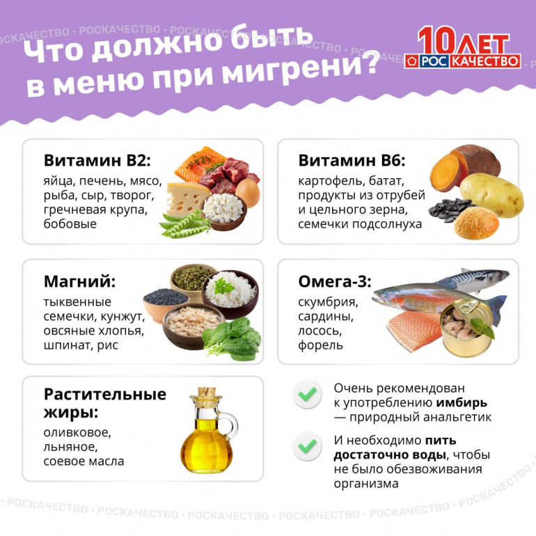 Полезно употреблять продукты, богатые витаминами группы B, магнием, омега-3 кислотами и растительными жирами. Это мясо, рыба, яйца, бобовые, зелень, орехи, крупы и натуральные масла, такие как оливковое или льняное. Имбирь, обладающий обезболивающим эффектом, также может помочь. И главное — пить достаточно воды, чтобы избежать обезвоживания.