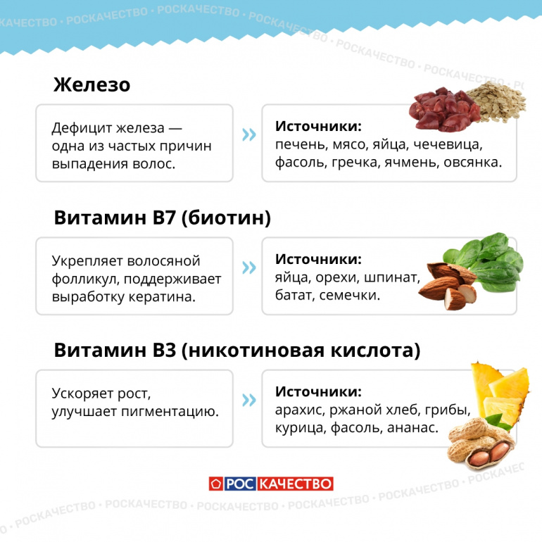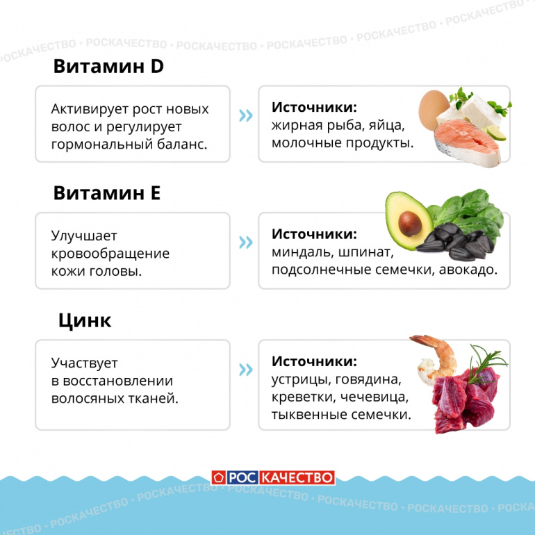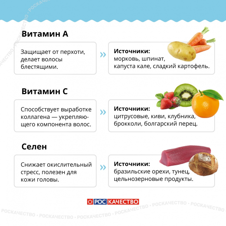 Витамины A, C, D, E, а также группы B, железо, цинк и селен играют ключевую роль в здоровье волос.