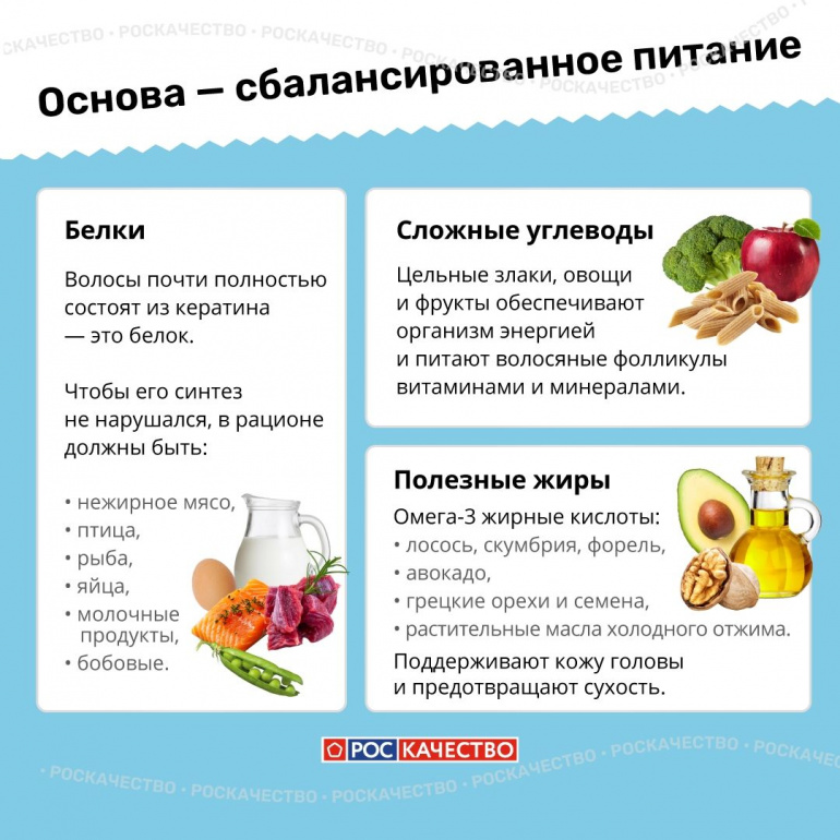 Волосы состоят из белка — кератина, и без достаточного количества мяса, рыбы, яиц, бобовых и молочных продуктов рост замедляется. Овощи, фрукты и цельнозерновые продукты обеспечивают фолликулы витаминами и энергией. Жирные кислоты омега-3, которые содержатся в рыбе, орехах и авокадо, улучшают состояние кожи головы и предотвращают ломкость.