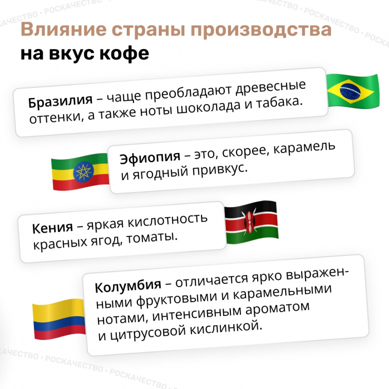 Важен и регион выращивания: бразильский кофе — с древесными нотами, эфиопский — с ягодным привкусом, кенийский — с кислинкой томатов, колумбийский — с фруктами и карамелью.