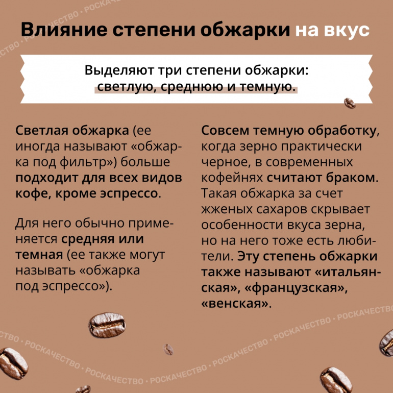 Обжарка тоже играет роль: светлая — для фильтр-кофе, тёмная — для эспрессо, а слишком чёрное зерно может скрывать вкус и указывать на некачественную обжарку.