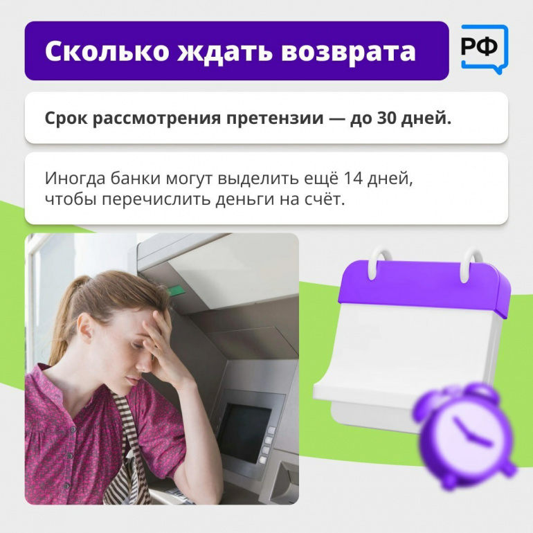 Будьте готовы к тому, что претензию могут рассматривать до 30 дней. Ещё 14 дней банки могут выделить на то, чтобы перечислить деньги на ваш счёт.