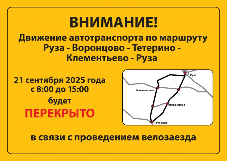 В день проведения велогонки будет ограничено движение автотранспорта по маршруту Руза — Воронцово — Тетерино — Клементьево — Руза. Ограничение будет действовать с 8:00 до 15:00. Водителей просят заранее планировать маршрут, а лучше прийти и поддержать участников мероприятия.
