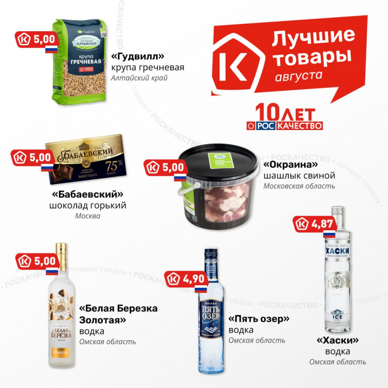 Не обошли вниманием и мясные изделия: классический свиной шашлык «Окраина» подтвердил своё высокое качество. В списке оказались и алкогольные напитки — водка «Белая Берёзка Золотая», «Пять озёр» и «Хаски».