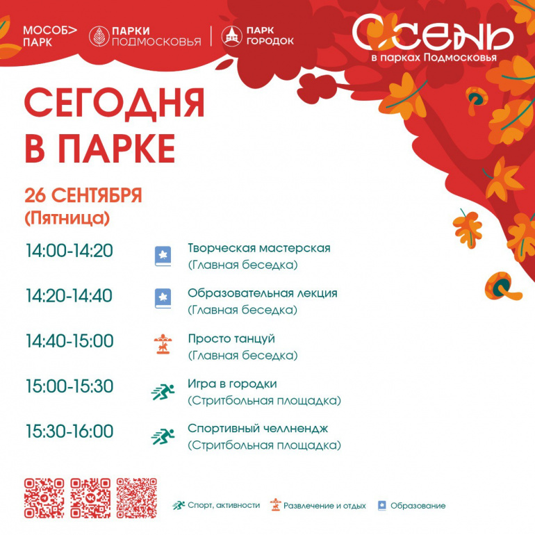 В пятницу, 26 сентября, рузский парк «Городок» подготовил новую порцию развлечений для взрослых и детей. Какие активности ждут гостей, перечислили сотрудники общественного пространства.