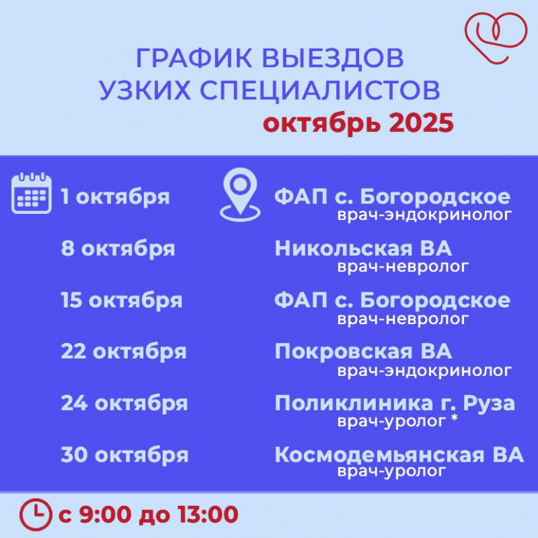 Публикуем график выездов узких специалистов Рузской больницы: