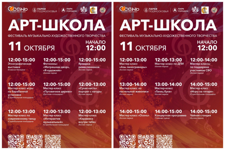 Фестиваль музыкально-художественного творчества «Арт-школа» начнётся 11 октября в 12:00. В программе: этнографическая выставка, фотозоны, ярмарка изделий от мастеров, мастер-классы по игре на барабанах и гитаре, занятия по современным танцам, созданию стеклянной мозаики и пастельной живописи. Завершат праздник концертом живой музыки.