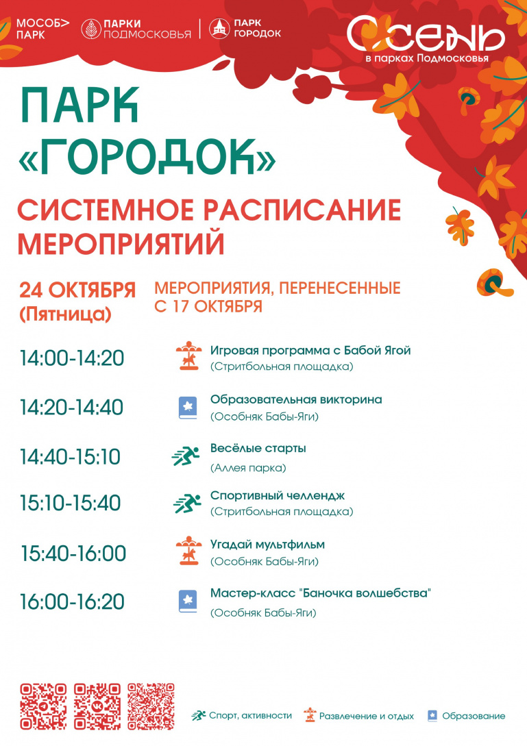 Целых два дня посетителей рузского парка «Городок» будет ждать море игр, творческих событий и спортивных активностей на свежем воздухе. Публикуем афишу развлечений, которые пройдут в общественном пространстве с 22 по 24 октября.