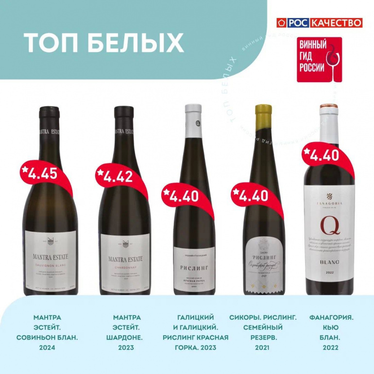 В топ-5 белых вин этого года вошли «Мантра Эстейт Совиньон Блан», «Мантра Эстейт Шардоне», «Галицкий и Галицкий Рислинг Красная Горка», «Сикоры Рислинг Семейный Резерв» и «Фанагория Кью Блан».