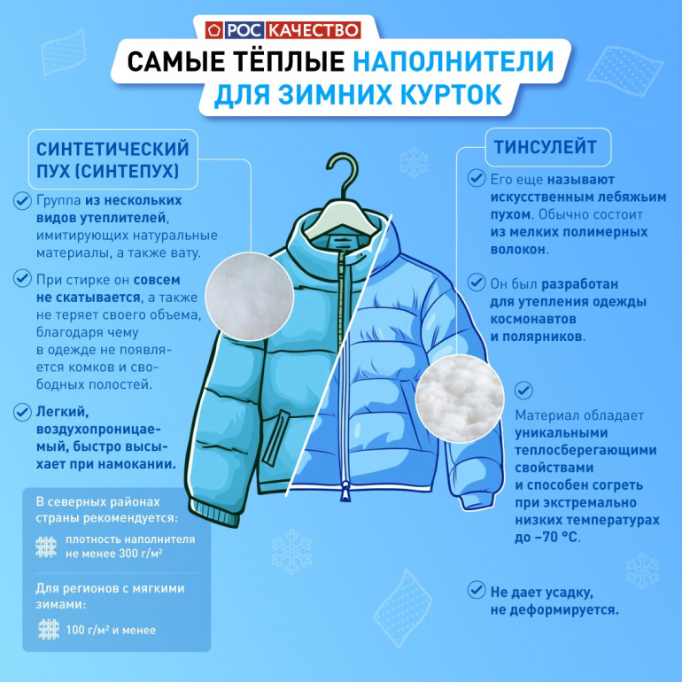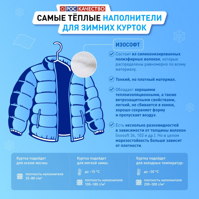 В Роскачестве подчёркивают, что хороший зимний наполнитель должен сочетать теплоизоляцию и воздухопроницаемость. Куртка должна удерживать тепло в минусовые температуры, но не приводить к перегреву, если на улице потеплеет. С этим хорошо справляются полиэстеровые материалы — синтепон, изософт, холлофайбер, синтетический пух и тинсулейт. Их общий принцип — создание воздушной прослойки между волокнами, которая и обеспечивает защиту от холода.