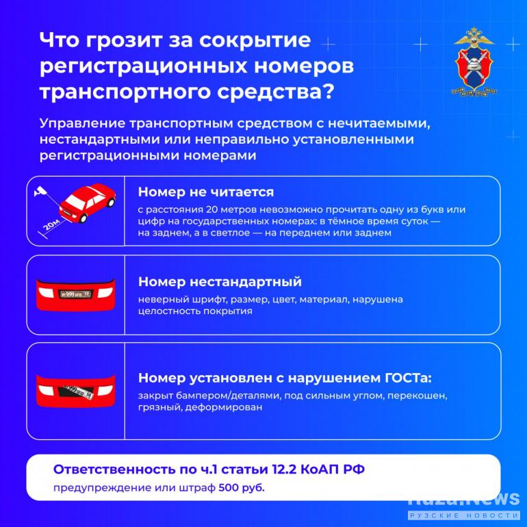 За сокрытие регистрационных номеров транспортных средств водителю грозит административная ответственность – от штрафа до лишения прав. Об этом в субботу, 29 ноября, напомнили в полиции Рузы.