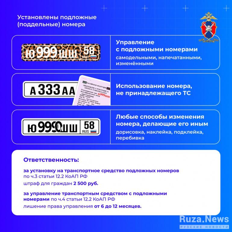 За управление автомобилем с поддельными номерами лишат водительских прав на срок от шести до 12 месяцев. За установку поддельных номеров предусмотрен штраф в размере 2,5 тысяч рублей.