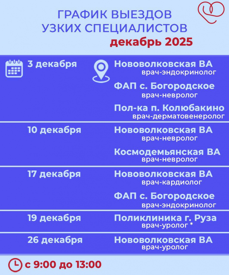 Эндокринолог, невролог, кардиолог, уролог и дерматовенеролог приедут к пациентам из посёлков Рузского округа в декабре. Публикуем подробный график выездов специалистов.